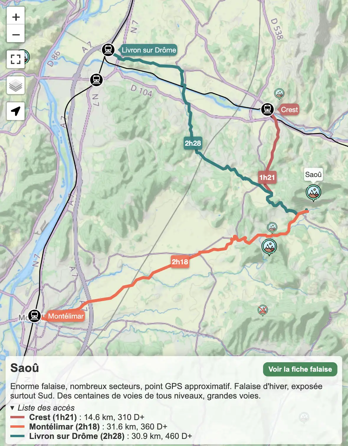 Les falaises et leurs accès vélo+train sont renseignés par la communauté. Tu connais bien un secteur ? Tu veux partager ton expérience vélo-grimpe ? C'est par ici !
