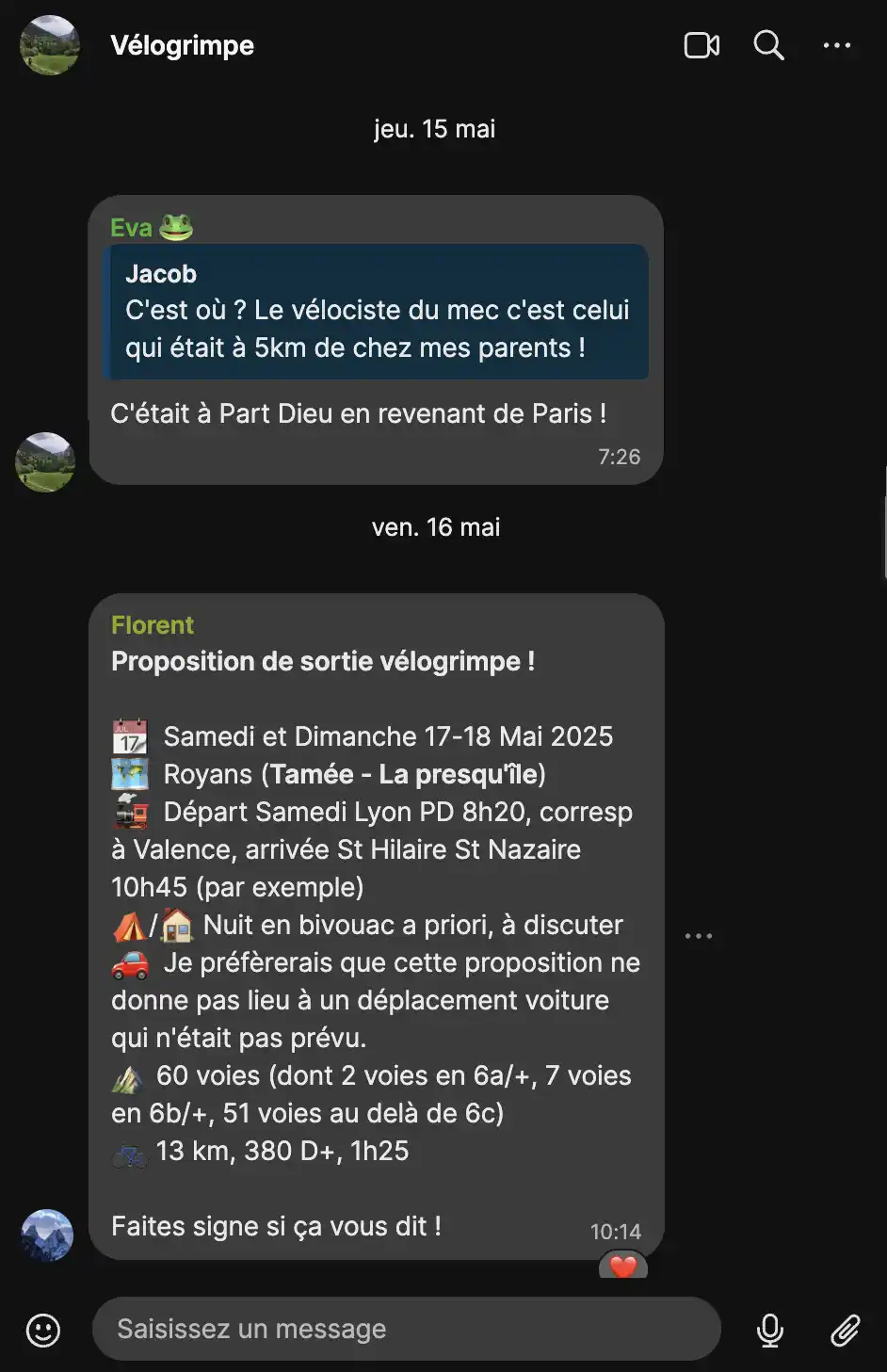 Tu cherches des partenaires pour aller vélogrimper à plusieurs ? Nous avons un groupe sur Signal dans lequel chacun partage ses propositions de sorties et son expérience.