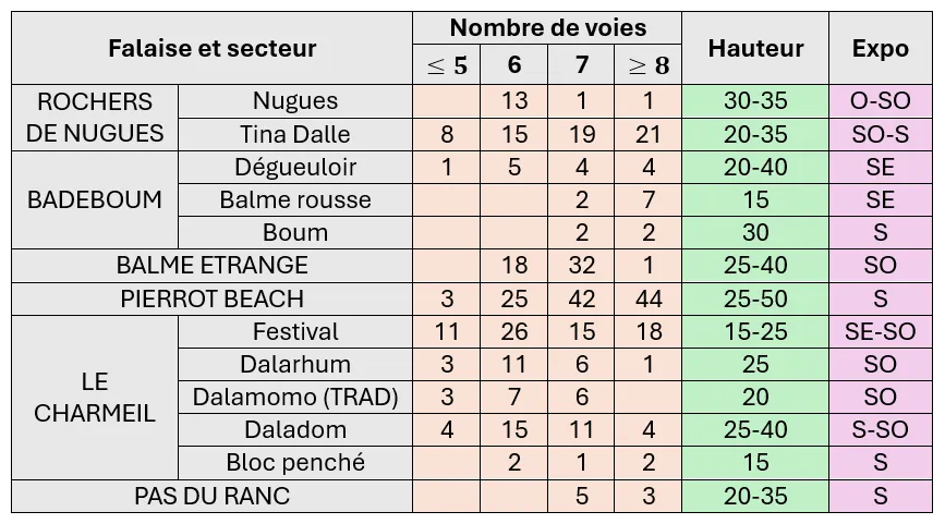 Enorme falaise : plus de 340 grandes voies (voir ci-dessous), et près de 420 longueurs de couenne dans les secteurs Tina Dalle, pas du Ranc, Daladom, Dalarhum, Festival, Pierrot beach, Balme étrange. Faut acheter le topo !